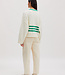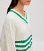 Is een zachte kabeltrui in crème met frisse groene strepen op de borst en aan de hals. De V-hals geeft een vrouwelijke touch, terwijl de sportieve details zorgen voor een moderne twist. Mooi op een lichte jeans of gekleed met een pantalon voor een frisse voorjaarslook.
