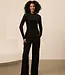 Klassieke pantalon in een zwarte kleur. Is afgewerkt met steekzakken. Komt in een stevige geweven stof waarin een subtiele structuur in zit verwerkt. Heeft een hoge taille en valt recht tot iets wijder van pasvorm.