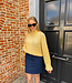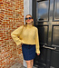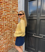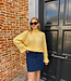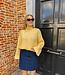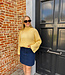 Donkerblauwe denim rok met structuur. Heeft een hoge taille en loopt recht tot iets wijder uit. Ideaal voor de dames want deze komt iets langer. Ook een topper als je wat groter bent.