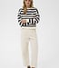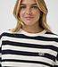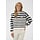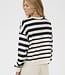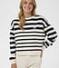 Gestreepte sweater in het wit met donkerblauw. Is een boxy/losser model en heeft een dunne fleece aan de binnenkant. De strepen lopen over van breed naar smal.