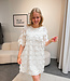 Deze jurk is een echte showstopper! De speelse franjes en het subtiele zigzagpatroon geven je look meteen een feestelijke en unieke touch. De jurk heeft een recht model met halve mouwen en een ronde hals, en sluit achteraan met een knoopje boven een elegante uitsnijding. Gemaakt in een lichte en luchtige stof, ideaal voor zomerse feestjes of festivals. Draag met sneakers voor een casual vibe of met hakken voor een avondje uit. Ook heel leuk met laarsjes voor een boho vibe!